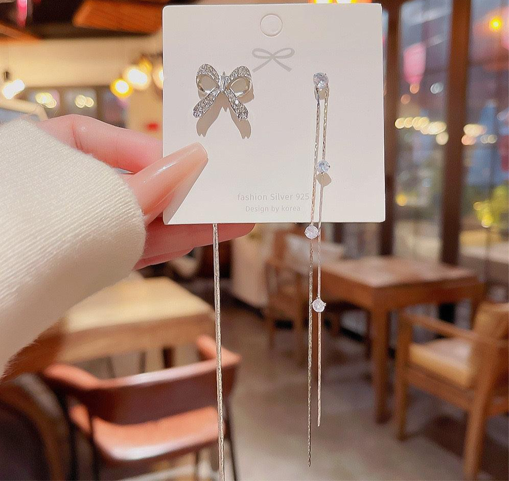 Elevate your look with the stunning Korean Style Chain Drop Earrings—where elegance meets versatility. These exquisitely crafted earrings feature a delicate chain design with a graceful bow pattern, offering a timeless touch of charm to any outfit. Whether you're attending a formal soirée, heading to a party, or simply want to add flair to your everyday wear, these earrings strike the perfect balance between sophistication and modern style. Their lightweight design (only 5g) ensures all-day comfort, while the silver-plated alloy/brass finish provides a beautiful luster that complements any skin tone. Thoughtfully packed on a card and in a polybag, they make a perfect gift for someone special—or a chic treat for yourself.